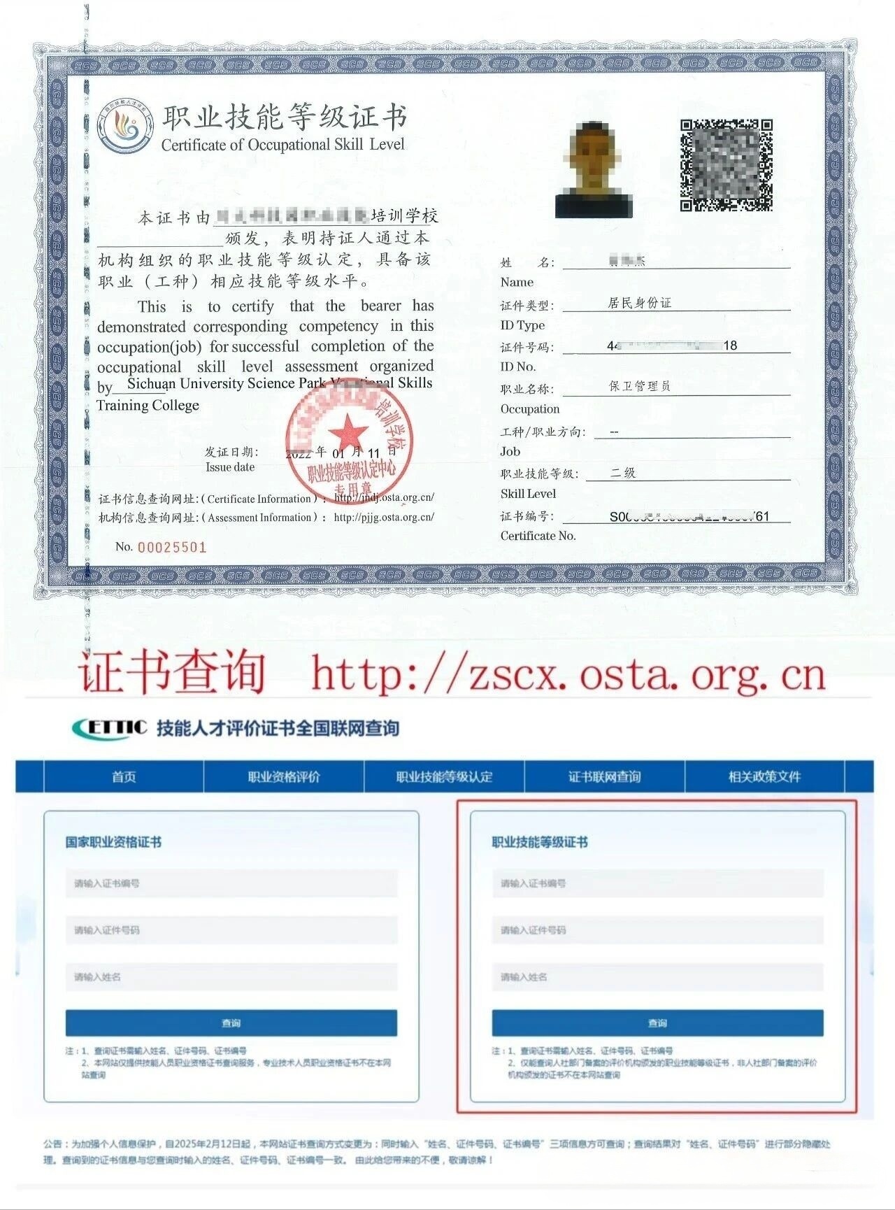 (5)取得保安员(四级/中级工)职业资格证书(技能等级证书)后,累计从事相关职业①工作2年(含)以上。